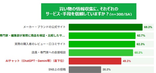 買い物の情報源として各手段の信頼度を聞いたところ、「信頼できる」と答えた人が最も多かったのは「メーカー・ブランドの公式サイト(69.3%)」、次いで「専門家・編集部が実際に商品を検証・比較した商品比較サイト(62.7%)」「実際の購入者のレビュー・口コミサイト(62.3%)」。「AIチャット(ChatGPT・Gemini等)」は49.3%と全項目中最下位となりました。