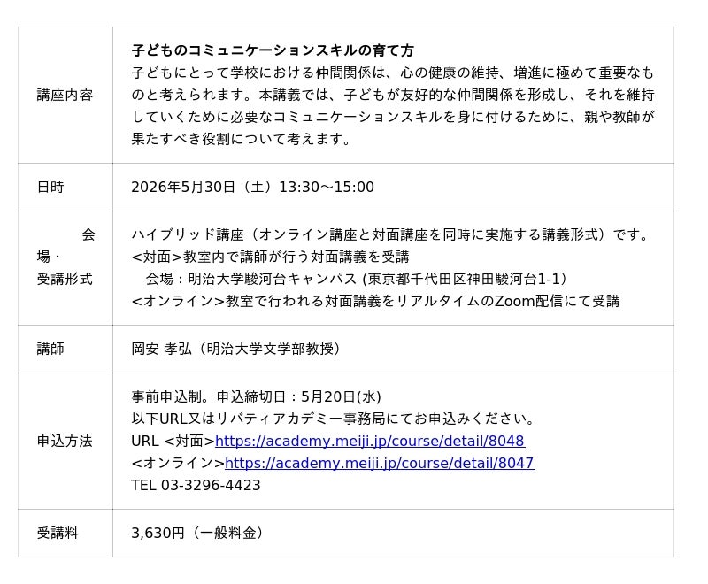 明治大学の生涯学習機関「明治大学リバティアカデミー」は、2026年度春期に「子どもの育ち」をテーマにした特別講座を開講します。主に保護者、教育関係者、子ども支援に関心のある方を対象に、臨床心理学などを専門分野とする明治大学の教授陣が講師を務めます。子どもの健康の維持や、子どもの生きる力について考えるとともに、大人にできることについても考える機会とします。講座ごとに事前申込が必要です(有料)。