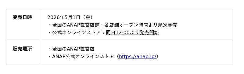 ギャル雑誌『egg』の人気モデル「あいさ」「伊藤愛依海(あいみん)」「佐藤芹菜(せりな)」の3名が、アパレルブランド「ANAP」のデザイン監修をしたコラボレーションアイテムが2026年5月1日(金)より全国のANAP直営店および公式オンラインストアにて発売いたします。