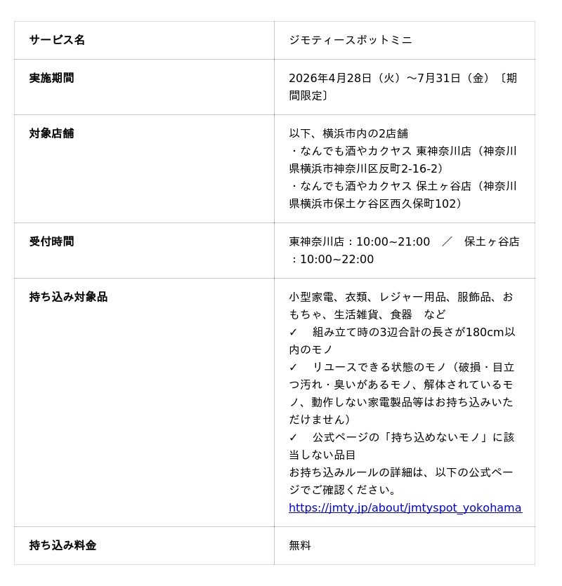 株式会社ジモティー(以下「ジモティー」)と株式会社ひとまいる(以下「ひとまいる」)の子会社である株式会社カクヤス(以下「カクヤス」)は、酒類の販売およびデリバリーを行う「なんでも酒やカクヤス」の横浜市内2店舗に、家庭の不要品を無償で持ち込める回収スポット「ジモティースポットミニ」を2026年4月28日より設置します。