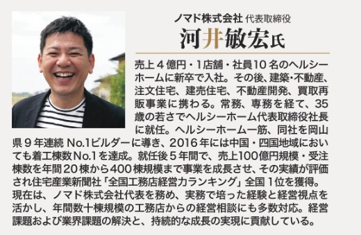 本セミナーでは、かつてヘルシーホームを年間20棟から400棟へと成長させ、全国工務店経営力ランキングNo.1に導いた河井敏弘氏(現:ノマド株式会社代表取締役)と株式会社ビズ・クリエイション代表取締役、初谷昌彦氏にご登壇いただき、工務店における「逆張り」の経営戦略と組織構築についてお話しいただきます。