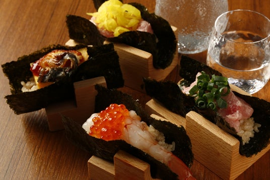 渋谷牡蠣ベースの手巻き寿司は目でも楽しい盛り付けで見映え良し!「いくら海老手巻き750円」「チャンジャクリームチーズ手巻き550円」食べ応えあるお寿司をご堪能頂けます。