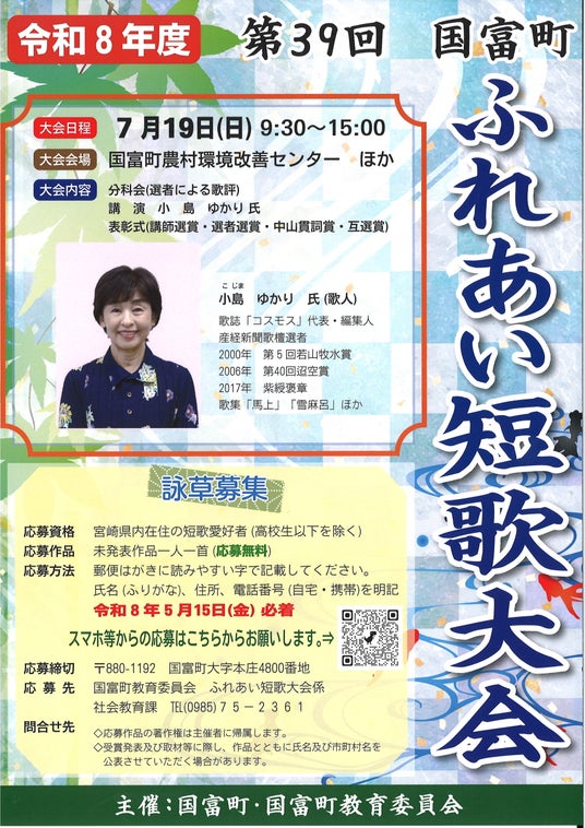 応募・送付先: 〒880-1192 国富町大字本庄4800番地 国富町教育委員会「ふれあい短歌大会係」