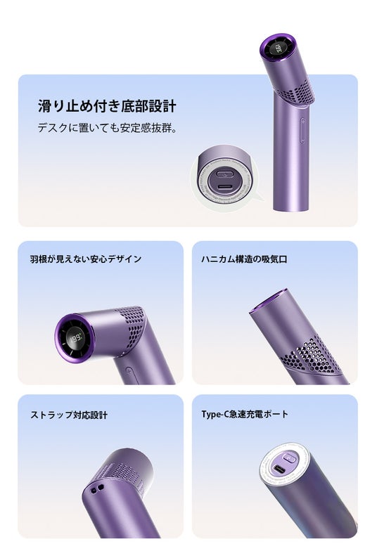 室内での微風モードから、炎天下でも涼しく過ごせるパワフルな強風モードまで、シーンに応じて最適な風を選べます。オフィス・通勤・アウトドア・フェスなど、どんな場面でも活躍します!