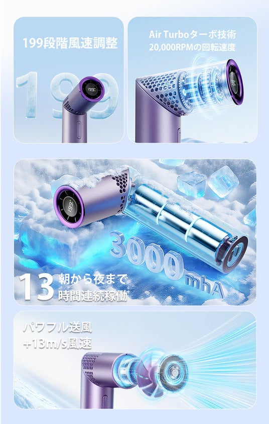 さらに最大20,000RPMの高速ブラシレスモーターを搭載することで、最大風速13m/sのパワフル送風を実現。