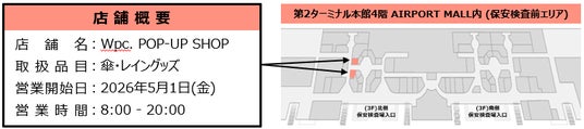2026年5月1日(金)、成田空港第2ターミナル本館4階 AIRPORT MALL内に、傘やレイングッズを取り扱う「Wpc. POP-UP SHOP」 が期間限定でオープンいたします。