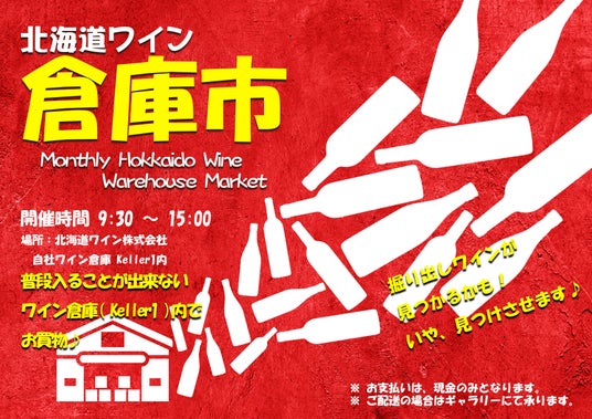 普段は入ることのできないバックヤード「ワイン保管倉庫」を期間限定で開放し、「倉庫市」を開催いたします。ここでは、特別価格でワインセットや箱買いワインなど、数量限定のお得な商品を販売。この機会をお見逃しなく!倉庫の中をのぞいてみるだけでも楽しいイベントです。見学だけでも大歓迎です。