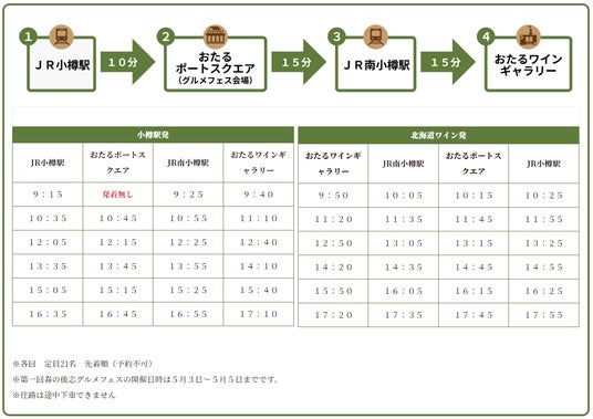 北海道ワイン株式会社(本社:北海道小樽市、以下当社)が運営する「おたるワインギャラリー」は、2026年5月2日(土)から5月5日(火・祝)までのゴールデンウィーク期間、当社による自主企画として小樽の主要駅とイベント会場をダイレクトに結ぶ「無料往復巡回バス」を運行いたします。