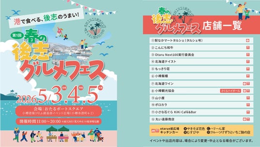 「海と人がつながる場所」おたるポートスクエアにて開催される「第1回 春の後志グルメフェス」には、後志エリアの人気店12店舗が集結。当社も出店企業として自社ワインの魅力を発信いたします。
