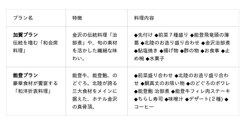 北陸の伝統を重んじる「和会席」と、華やかな「和洋折衷」の2種類をご用意。どちらのプランもお一人様20,000円(税・サービス料込)で、以下の充実した内容が含まれます。プランに含まれるもの: