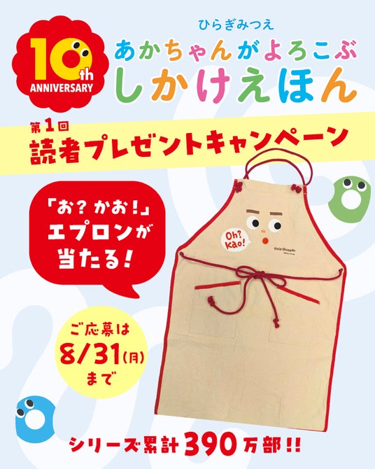『お?かお!』のイラスト入りエプロンが当たるキャンペーンを、5月上旬より開催します。あかちゃんがよろこぶしかけえほん特設サイト、または、フェア開催書店で配布の「あかちゃんがよろこぶしかけえほん10周年記念シール」のQRコードから応募してください。抽選で100名に、『お?かお!』エプロンをプレゼントします。【実施期間】2026年4月28日(火)~2026年8月31日(月) 23:59まで