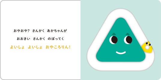 10周年を記念した最新刊『おや?ころりん!』は、このシリーズを代表する絵本『ころりん・ぱ!』に、新機軸のアイデアを加えた絵本です。これまでの作品は、丸いパーツがレールを転がるしかけが最大の特徴でしたが、『おや?ころりん!』は、パーツの形が楕円、三角、四角と様々。「形のちがいを楽しんで欲しい」という作者ひらぎみつえさんの気持ちがこめられた意欲作です。