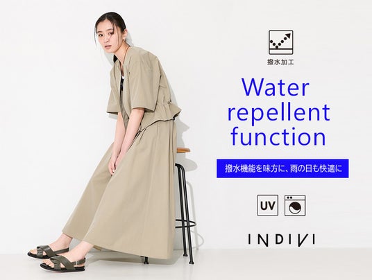 ワールドグループの株式会社フィールズインターナショナルが展開するレディースブランド「INDIVI(インディヴィ)」は、昨年ご好評をいただいた撥水加工を施した機能性アイテムの新作を、4月29日(水・祝)より公式オンラインストアおよび店舗にて発売いたします。