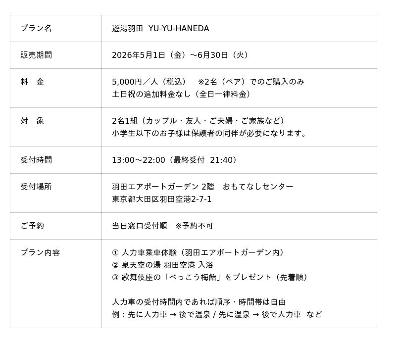 住友不動産商業マネジメント株式会社(本社:東京都新宿区/代表取締役社長:山本直人)が運営する、羽田空港第3ターミナル直結の複合施設「羽田エアポートガーデン」(所在地:東京都大田区)は、日帰りペアプラン「遊湯羽田 YU-YU-HANEDA」を販売します。人力車乗車体験と天然温泉「泉天空の湯 羽田空港」がセットになったお得なプランで、大切なパートナーや友人と特別なひとときをお過ごしください。