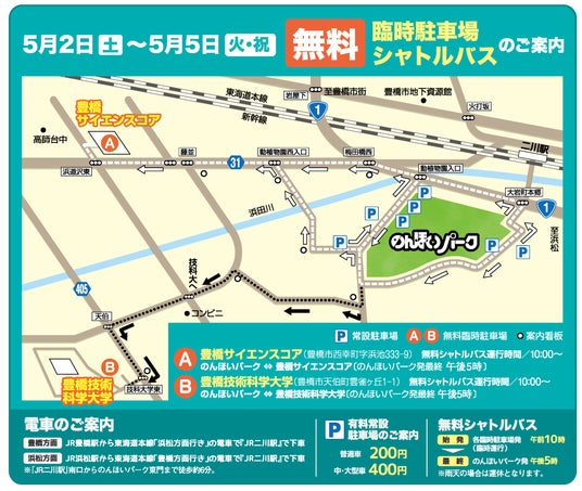 GW期間中、のんほいパーク周辺は大変混雑します。5月2日(土)~5月5日(火・祝)の期間に、お車でお越しの場合は、豊橋サイエンスコア及び豊橋技術科学大学に開設される無料の臨時駐車場もぜひご利用ください。 無料臨時駐車場では、無料シャトルバスの送迎も行います(雨天運休)。