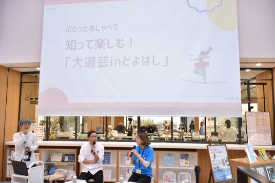 まちなか図書館の中央ステップであったトークイベント「ぷらっとおしゃべり 知って楽しむ! 『大道芸inとよはし』」には、橋本さんとプラットの大橋玲さんが登壇し、大道芸フェスの魅力や楽しみ方を語りました。