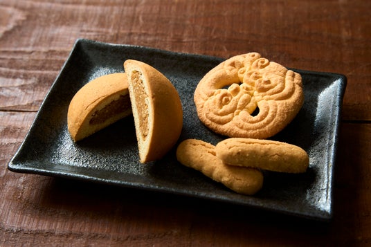 紅芋あんに紅芋クリーム、さらにパイも入れて求肥で包んだ大福。シーサー型の最中で挟むと、より沢山の食感を楽しめます。