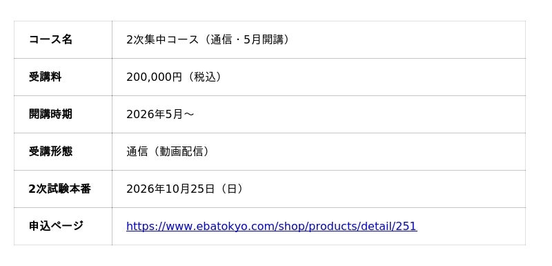 2026年10月25日(日)に実施される2次試験(筆記)まで残り約6か月。ゴールデンウィークからの学習スタートに合わせた本クラスの追加により、令和8年度合格を目指すすべての方が最適なタイミングで本格的な対策を始められる環境を整えました。