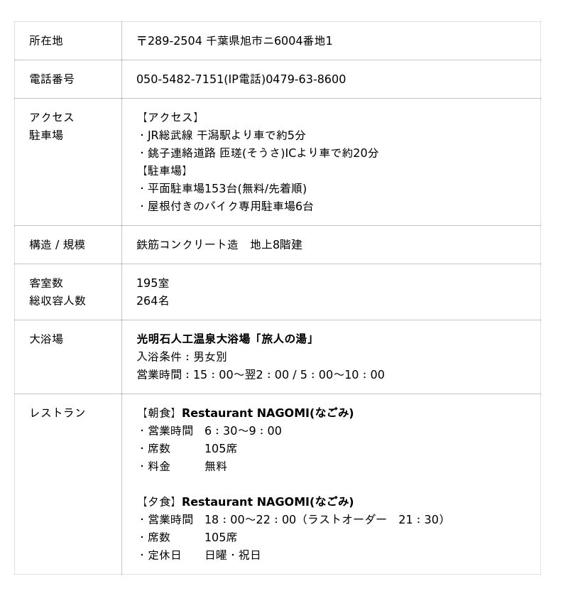 旭市周辺の観光やビジネスの新しい拠点として、皆様のご宿泊を心よりお待ちしております。