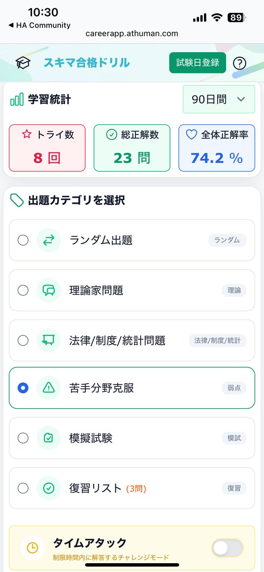 「スキマ合格ドリル」は国家資格キャリアコンサルタント試験の傾向や当社テキスト、講座情報をもとに、AIによる問題作問と評価を実施(学科:苦手分野判定、論述:答案評価・フィードバック)しています。受験の中心層である40~50代の現役世代が、忙しい合間(スキマ時間)に効率よく学習できるツールとなっています。【学科】