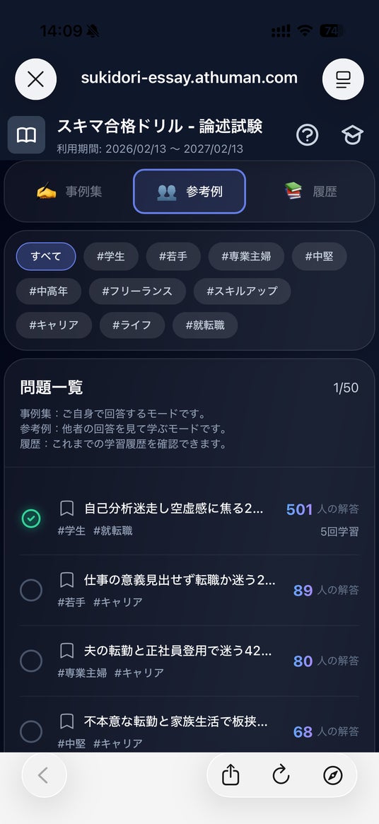 教育事業を展開するヒューマンアカデミー株式会社(本社:東京都新宿区、代表取締役:田中 知信、以下「当社」)は、国家資格キャリアコンサルタント試験対策ツール『スキマ合格ドリル』の一般販売を2026年5月より開始いたします。本サービスは、受講生の要望に応え、業界初(※)となる「AI論述添削機能」を新たに搭載。先行提供していた「学科版」での高い成果(合格率向上・高い利用率・満足度)を背景に、多忙な受験生の「学習時間の確保」と「実践演習の不足」という課題を解決します。