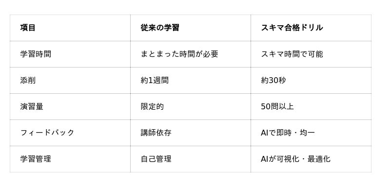 当社の受講者アンケートでも、特に論述試験対策において、添削待ち時間が長く復習のタイミングを逃す、正解が分かりにくい、演習量が圧倒的に不足(公開過去問は3回分のみ)という課題が浮き彫りになりました。当社は、これまでの講座運営10年間で得た膨大なデータとAIを融合。論述対策に先立ち導入した「学科版」では、AIによる苦手分析と反復学習により合格率向上という顕著な成果を上げています。この実績を背景に、「論述版」を追加し、通勤中や家事の合間といった「数分単位」を価値ある学習時間に変え、即時のフィードバックを可能にするプラットフォームを構築しました。キャリア支援者の質向上が急務とされる中、効率的な知識定着を実現します。