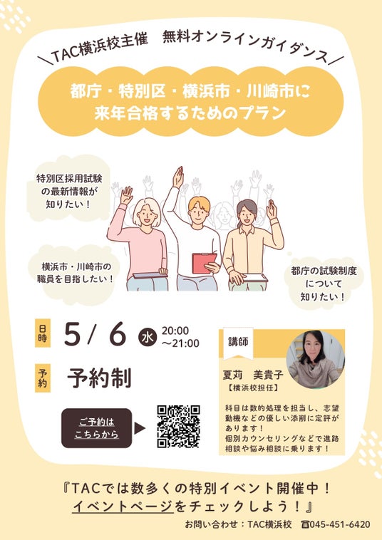 資格取得に向けた教育サービスを展開しているTAC株式会社(東京都千代田区)では、来年の公務員試験を検討されている方へ向けて「都庁・特別区・横浜市・川崎市に来年合格するためのプラン」を、オンラインで開催します。