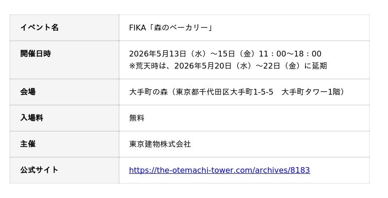 東京建物株式会社は、個性豊かなベーカリー19店舗※が集結するFIKA「森のベーカリー」を2026年5月13日(水)~15日(金)(各日とも11時~18時)の3日間にわたり、地下鉄大手町駅に直結する「大手町の森」(東京都千代田区、大手町タワー1階)で開催しますのでお知らせします。都心の森で過ごす特別なひとときをお楽しみください。