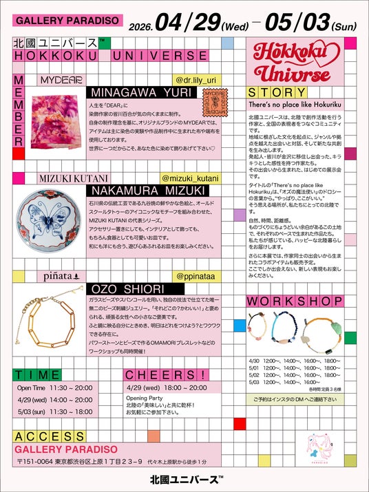 株式会社KUNCAがサポートする、北陸のクリエイターと全国の表現者をつなぐコミュニティ「北國ユニバース(TM)️(HOKKOKU UNIVERSE)」は、2026年4月29日(水)から5月3日(日)まで、東京・代々木上原のGALLERY PARADISOにて初のPOP-UP展示会を開催いたします。■ 開催背景:There’s no place like Hokuriku(やっぱり、ここがいい。そう思える場所が北陸)