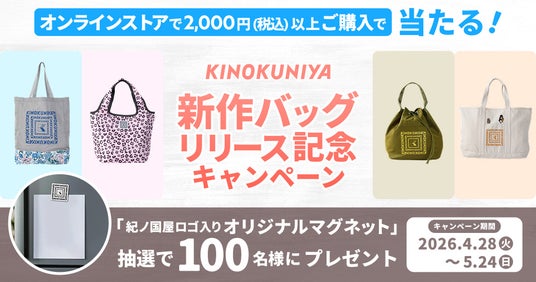 株式会社紀ノ國屋は、2026年4月28日(火)より、公式オンラインストアにて「新作バッグリリース記念キャンペーン」を実施いたします。本キャンペーンでは、期間中に税込2,000円以上ご購入いただいた方(公式オンラインストア内の全商品が対象)の中から抽選で100名様に、「紀ノ国屋ロゴ入り オリジナルマグネット」をプレゼントいたします。ぜひこの機会に、公式オンラインストアでのお買い物をお楽しみください。