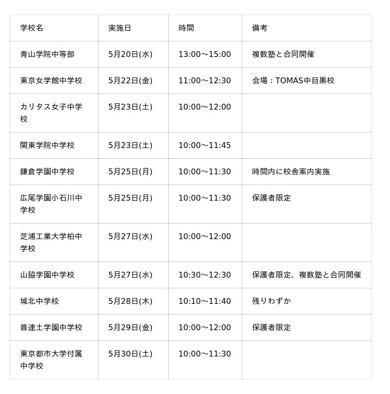 株式会社リソー教育グループ(本社:東京都豊島区、代表取締役:天坊真彦)の子会社である、株式会社TOMAS(本社:東京都豊島区、代表取締役:町田仁)は、「有名中高一貫校 学校見学説明会2026」について、2026年5月後半の開催日程をお知らせいたします。5月後半は、青山学院、巣鴨、東京女学館ほか計11校での開催を順次実施いたします。