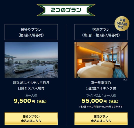 開催場所が千葉・木更津市にある「ホテル三日月」ということもあり、日帰りと宿泊の2つのプランをご用意しました。日帰りプランでは、第1部入場券と龍宮城スパ三日月の日帰りスパ施設が楽しめるお得なセットになっております。宿泊プランは先着60名様となっており、1日限定のファンミーティングとなりますので、早めのお申込みをお待ちしております。