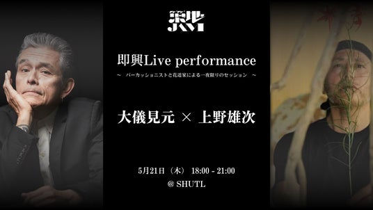 パーカッショニストの大儀見元と花道家・現代アーティストの上野雄次による一夜限りのセッション。東銀座のアートスペースSHUTLを舞台に、築地JAMのオープニングアクトとなる注目のライブパフォーマンス。