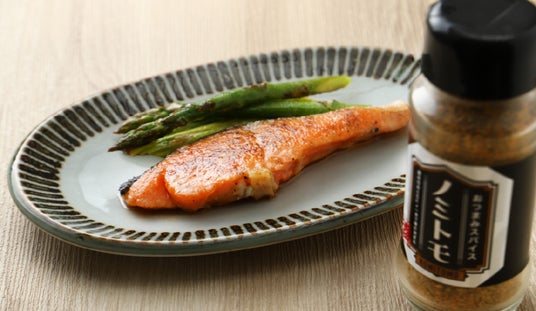 スパイス香る魚のムニエル焼いた鮭や白身魚などに「ノミトモ」をさっと振りかけるだけで完成します。魚介の旨味にスパイスのキレが加わります。白ワインやハイボールにも好相性です。