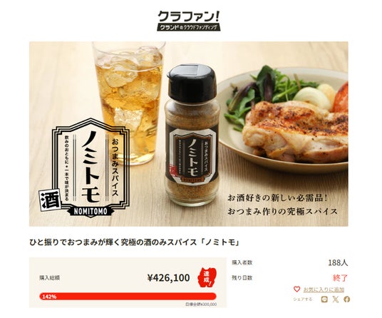 2026年1月15日(木)より実施した、お酒に合う味わいを追求したスパイス「おつまみスパイス ノミトモ」のクラウドファンディングサービス「クラファン!」での先行発売が、2月12日(木)24:59をもって終了いたしました。目標額300,000円に対し、142%となる総額426,100円を達成、総勢188名のサポーターの皆さまにご支援いただきました。